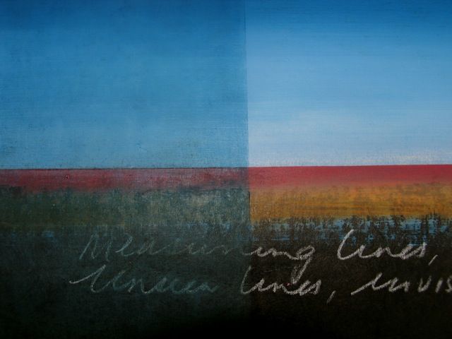 1 March 2013The exhibition title came from a dream in 2009 just after I moved to Timaru. Prompted by that, I started to make works but stalled shortly after for lack of art technique and understanding of the dream. Months later I came across a measuring line spoken about in the book of Zechariah 2.1 of the Bible. The dream signalled some fairly radical changes that I'd make in my thinking over the years ahead of me. Resolving these works as a point of focus, has been a slow layer by layer process- not only towards completion but also about understanding the bottom lines of my own faith. The measuring lines really are the length and breadth of that.